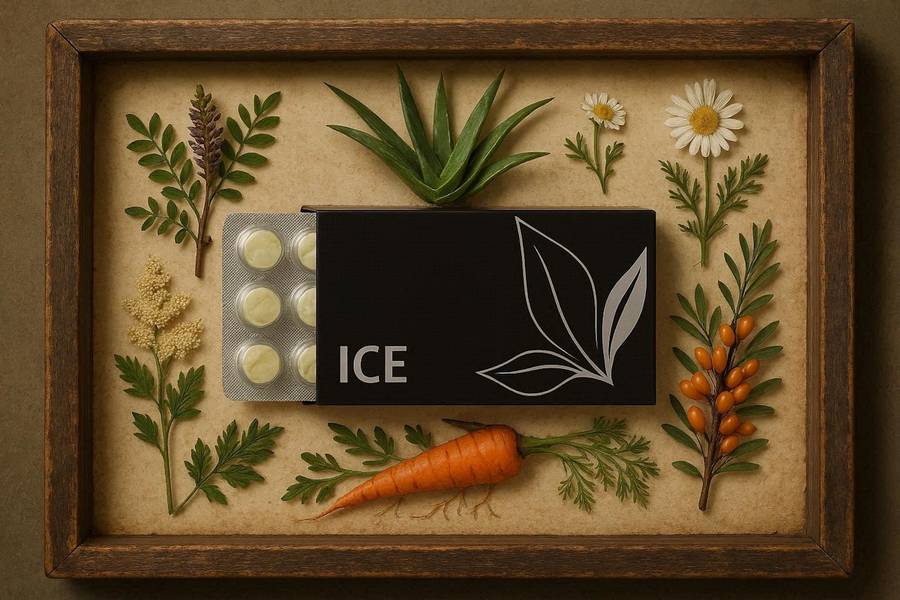 ICE is formulated with the following natural raw ingredients: Licorice, Aloe Vera, Chamomile Flower, Meadowsweet, Sea Buckthorn, Carrot, Molasses, Beet Sugar, and Mint Oil.